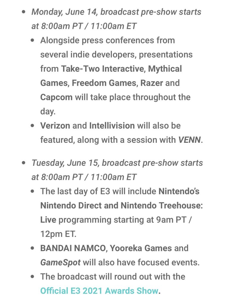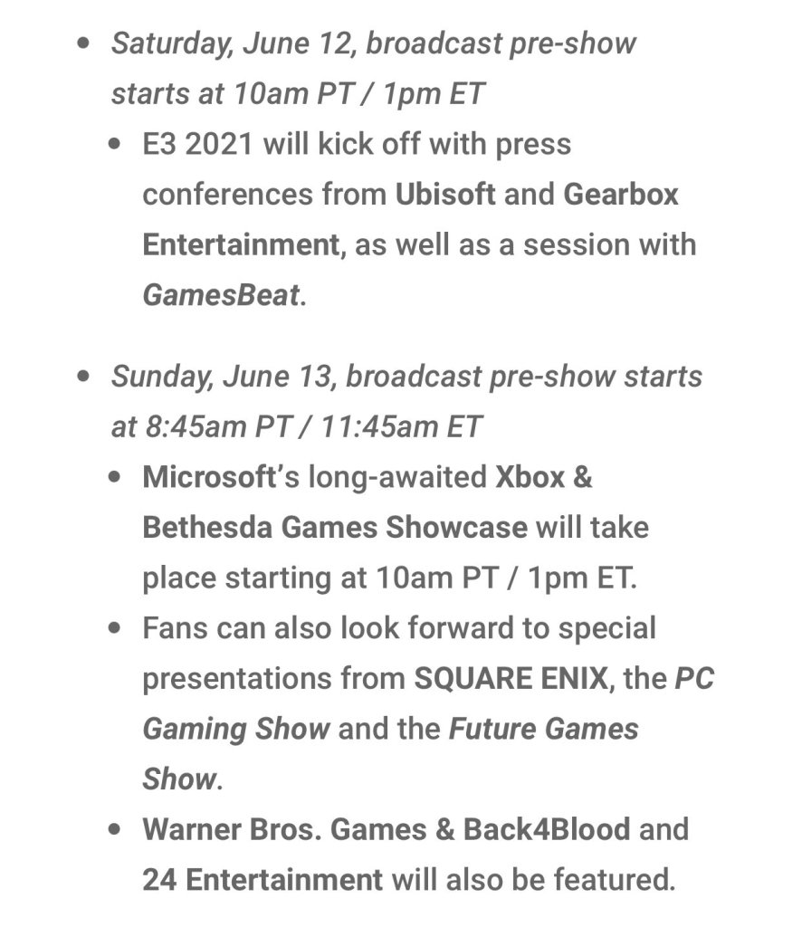Dado que esté año el E3 se llevará a cabo de forma remota, todo comenzará el sábado 11 de junio con el evento Koch Primetime Gaming Stream a las 2 de la tarde. El 12 de junio (primer día oficial del E3) habrá presentación de Gearbox Entertainment, Guerrilla Collective #2 a las 10 de la mañana, Wholesome Direct a las 12 del día y el Ubisoft Forward a las 2 de la tarde.
