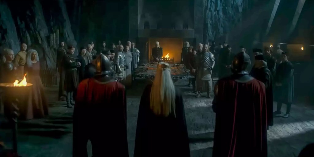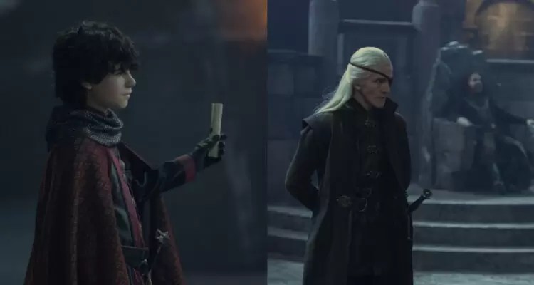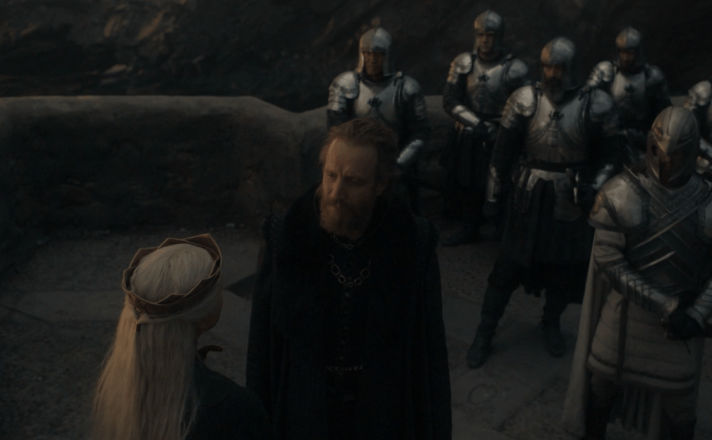 Seguido de esto vemos a un Daemon molesto por la decisión de Rhaenyra, de no iniciar una guerra de forma inmediata contra el bando de «los verdes» y titubear en recuperar el Trono de los Siete reinos, ya que él tiene la creencia de que estos mataron Viserys tan pronto tuvieron oportunidad, ella le dice que no es lo que hubiera querido su padre y le habla de “La canción de hielo y fuego”, y este reacciona de forma agresiva, tomándola por el cuello, a lo que ella responde: “él nunca te contó, ¿verdad?”; dándonos a entender que Daemon nunca fue considerado digno por Viserys para ocupar el puesto de Rey.