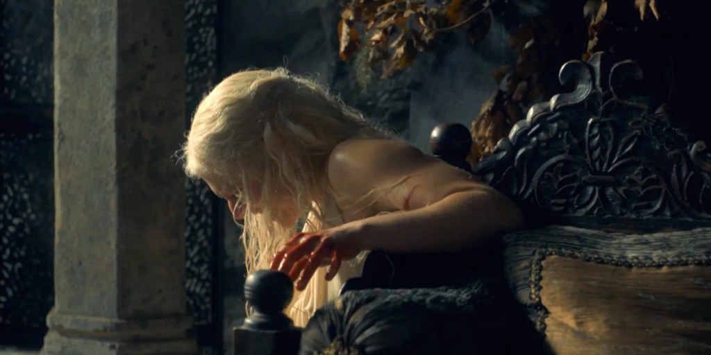 Acto, siguiente, Rhaenys entra a escena, revelando que Viserys ha muerto y que Aegon ha sido coronado rey. Además de advertirles, que los ‘Verdes’ vendrán tarde que temprano por ella y sus hijos. Como sabemos y vimos desde el episodio pasado, Rhaenyra está embarazada por sexta ocasión, el tercero con Daemon, y al parecer la noticia de estos acontecimientos hacen que el nacimiento de su primera hija se adelante, causándole mucho dolor y complicaciones durante el parto.