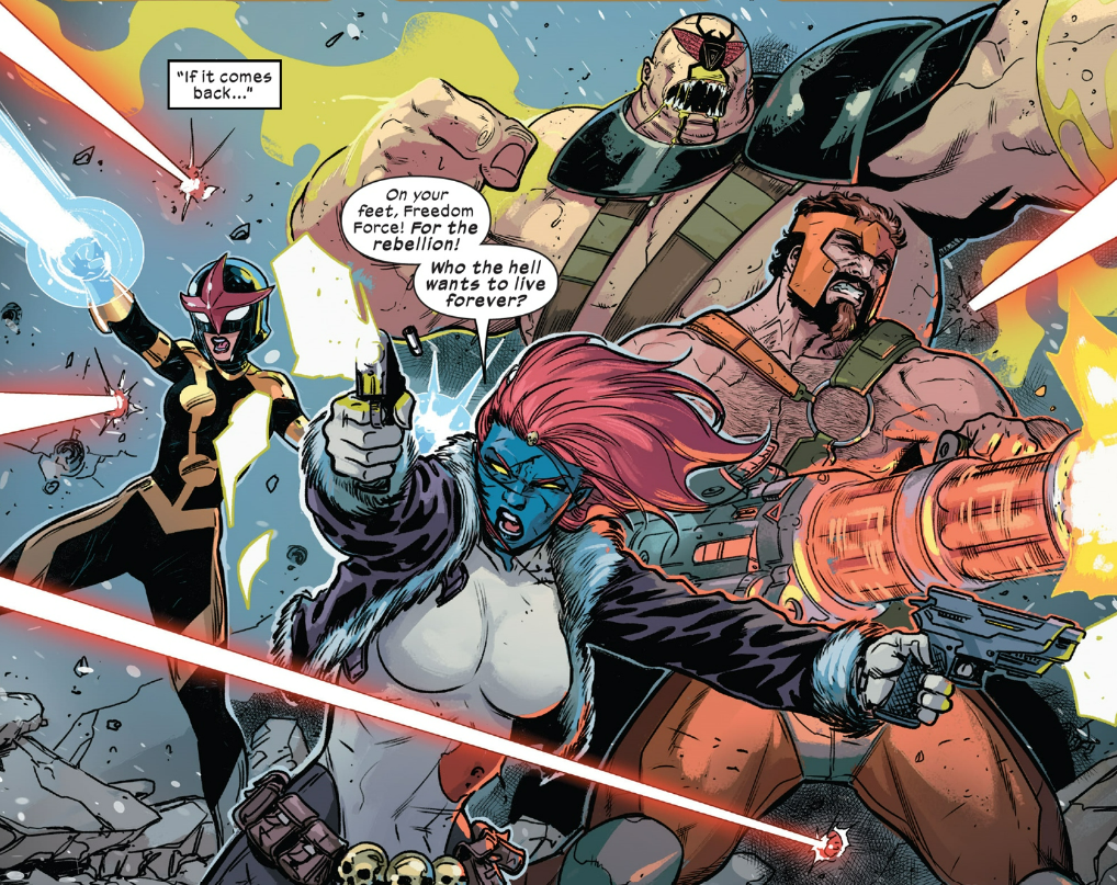 Mystique es quien lideraba Freedom Force, pero ha muerto. Ahora, para Destiny no significa nada su plan original que significó condenar al abandono a los mutantes con tal de conservar al amor de su vida. Este universo, ya no tiene sentido para ella.