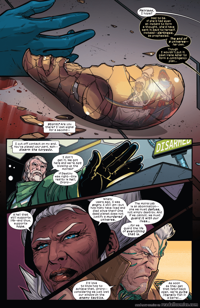 Mejorando los poderes de Destiny, se visualiza un futuro en el que la estrategia de Tormenta funciona gracias a una ejecución perfecta, destruyen el sol artificial en el centro de la esfera así como el laboratorio de Moira, dando como resultado el fin de ese universo, en pocas palabras: victoria.