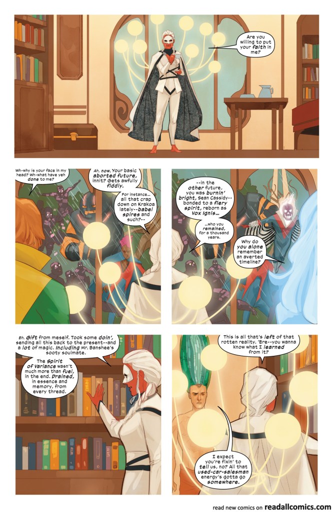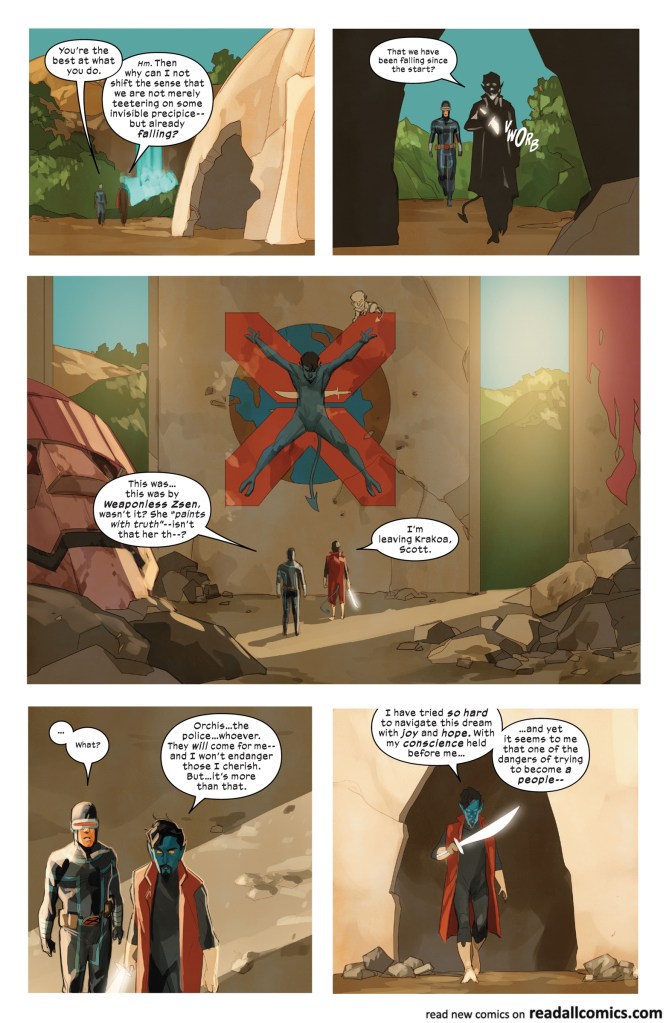 Con Legión y Nightcrawler como los mutantes principales de este ejemplar, los temas de espiritualidad y fe que vimos en Legion of X, y los conceptos de concordia y paz que terminaron con la invasión de Nimrod a Krakoa y la muerte de Warlock llevan a un desenlace agridulce, donde Mother Righteous, que obtiene poder de los agradecimientos y hace esclavos a quienes lo hacen (lo vimos muchas veces en Nightcrawlers), es finalmente vencida en su propio juego, Orchis recibe una cucharada de su propia sopa, Margali Szardos la pasa mal, y Kurt… bueno, Kurt es quien recibe un golpe de realidad más duro, pues se da cuenta de que toda su teología, incluyendo el concepto de la Chispa son solo esfuerzos, tomando la decisión de dejar Krakoa, ante las acciones a las que fue obligado a realizar por culpa de terceros.