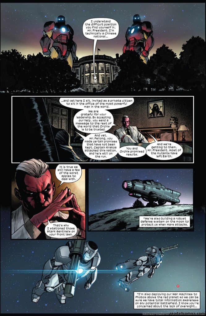 En Washington, el Presidente de los Estados Unidos ve a Krakoa como un sitio que amenaza al mundo si se le da la oportunidad, por lo que Feilong llega a un trato con él, quien endorsa a los Centinelas Stark para monitorear y neutralizar amenazas mutantes en el país.