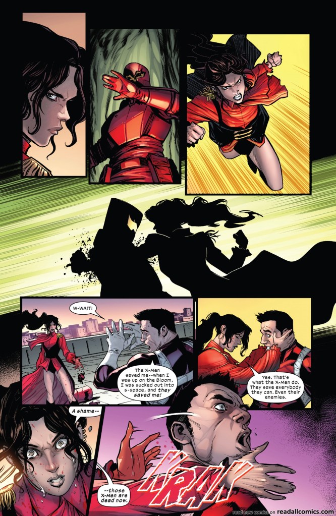 X-Men #25 es una muestra de lo peligrosa que puede ser la habilidad de intangibilidad de Kate Pryde, que arranca de manera insólita la etapa Fall of X. También es una carta de amor a la violencia que puede generar la venganza y el trauma de sobrevivir a un evento donde la muerte ronda. No solo destaca una Kate Pryde vengativa, sino que en dos subtramas, presenta al lector el camino que buscan ilustrar las revistas (o por lo menos las que están próximas a publicarse) que forman parte de esta entrada (incluyendo la de Iron Man, que coincide con lo que está viviendo Tony Stark)